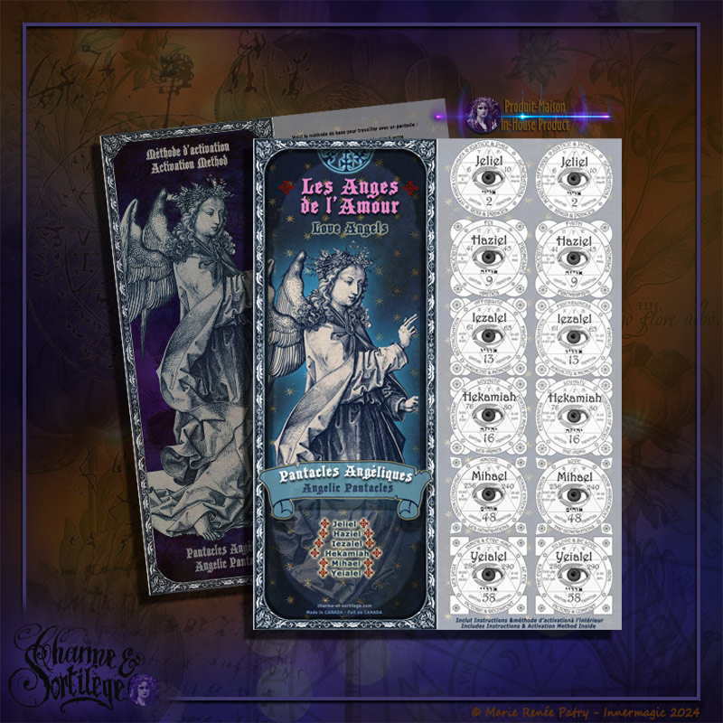 • Un document incluant 12 Pantacles de 6 Anges différents (1 en Français et 1 en Anglais), spécialisés dans le thème de l’Amour, Aimer et être aimer, Couples,  Amitiés, Loyauté, Fidélité, Promesses, Sincérité, Franchise, Union.